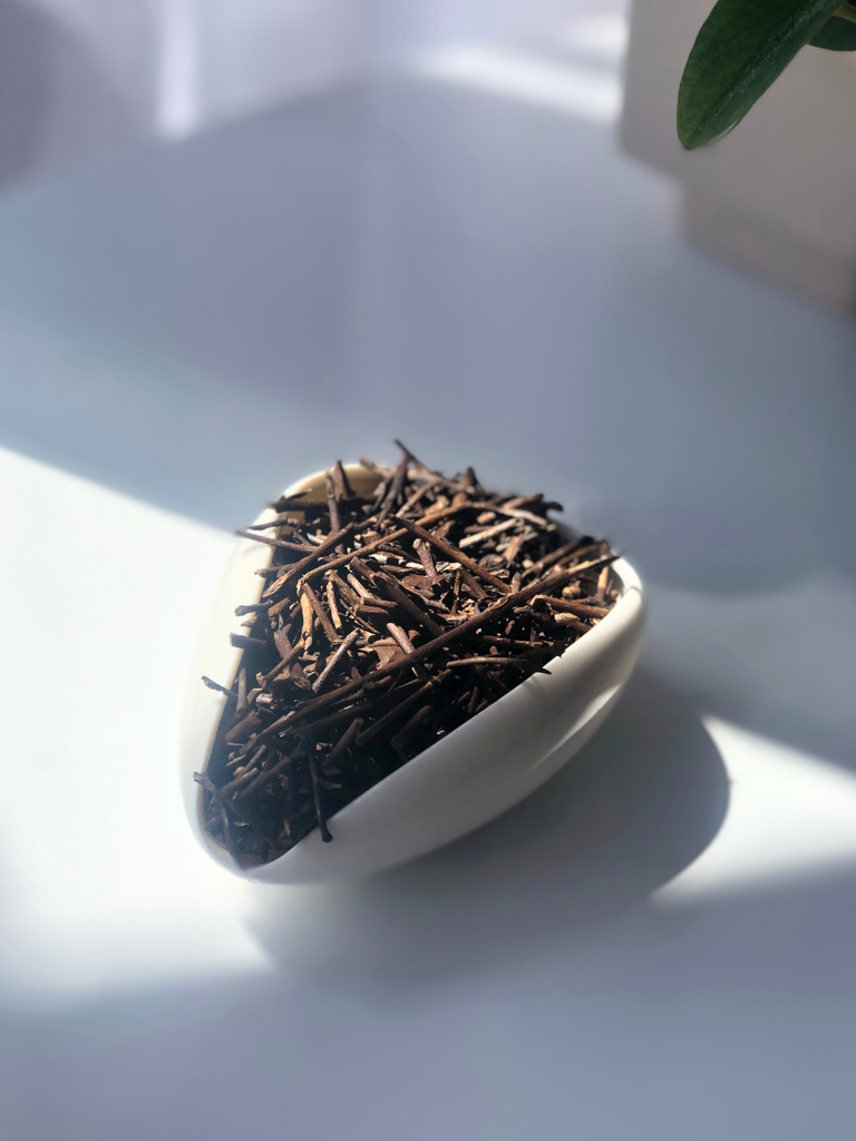 The stems are steamed, dried, then roasted, creating a rustic and mellow tea with notes of mocha, dried apricot and an aromatic hint of charcoal. It is very low in caffeine.